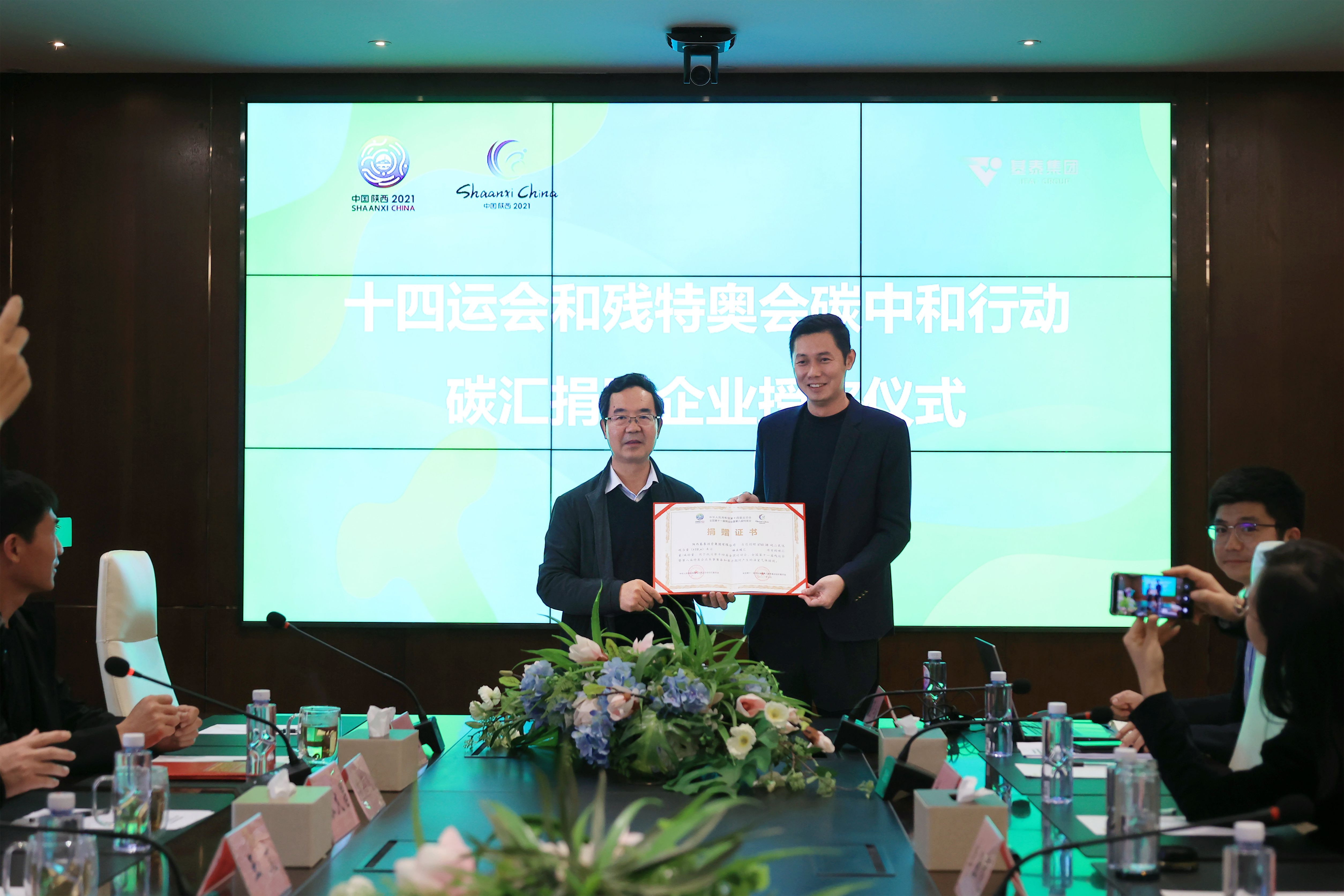 王文為基泰集團頒發(fā)“十四運會和殘?zhí)貖W會碳中和行動捐贈證書”。