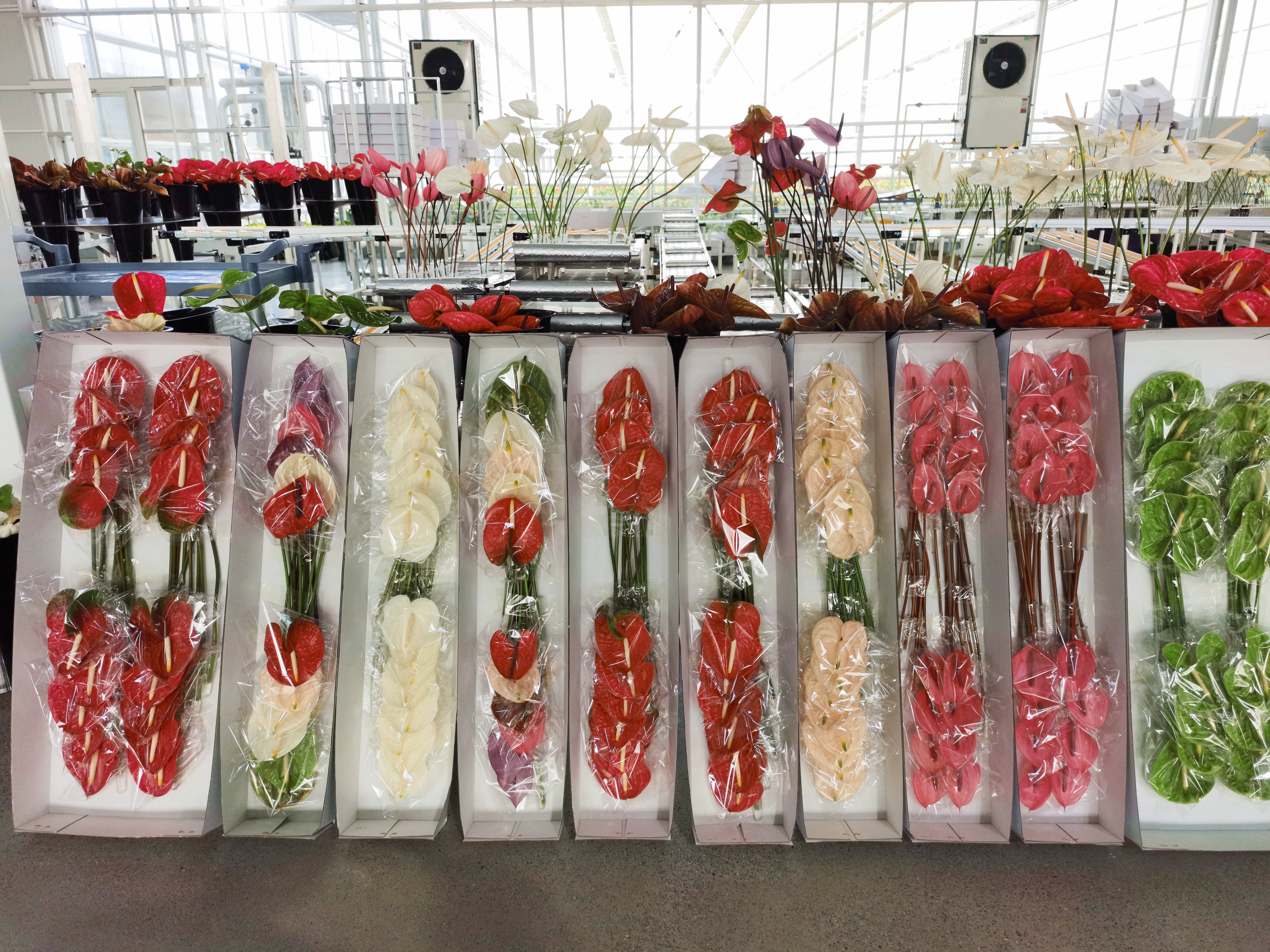 紅掌溫室共種植有28個(gè)品種,其中5個(gè)獨(dú)家品種,種苗均來自荷蘭安祖(anthura)公司,目前也正在和西北農(nóng)林科技大學(xué)共同研究新品種。另外,紅掌溫室在負(fù)壓文洛式溫室的基礎(chǔ)上加了氣候室,更有利于溫室環(huán)境調(diào)控的緩沖。