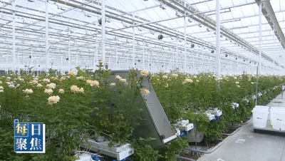 溫室內(nèi)部,玫瑰鮮切花整齊種植在巖棉基質(zhì)中,葉片翠綠、花朵艷麗,陣陣花香撲面而來?;﹫@藝特色設(shè)施農(nóng)業(yè)產(chǎn)業(yè)園運(yùn)營主管李朝陽介紹,溫室通過智能系統(tǒng)精準(zhǔn)控制溫度、濕度、光照和水肥,讓玫瑰、紅掌等鮮切花生長全程處于最佳環(huán)境中。