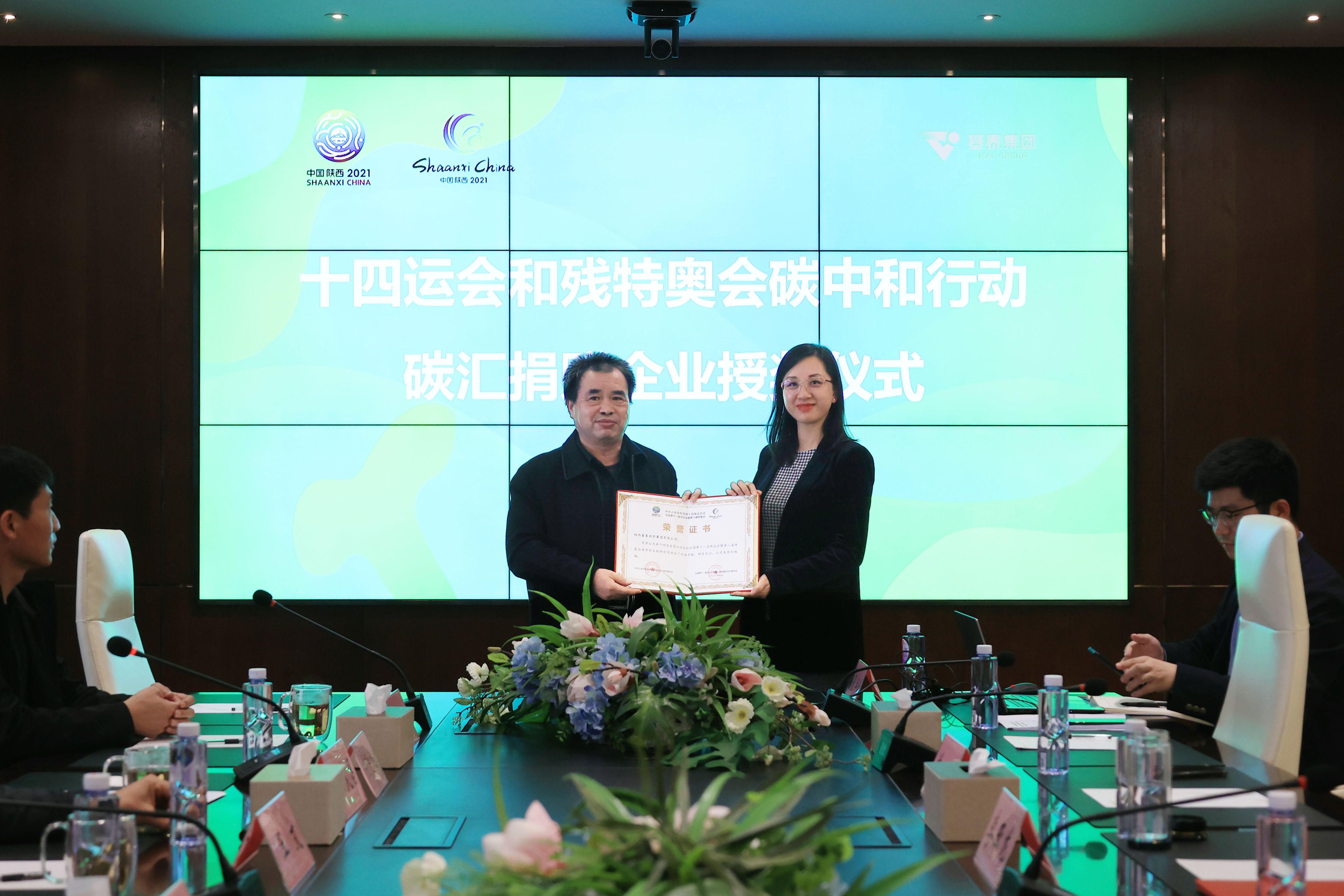 王文為基泰集團頒發(fā)“十四運會和殘?zhí)貖W會碳中和行動捐贈證書”。