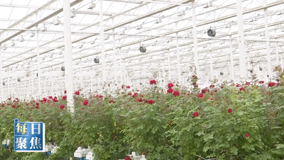 溫室內(nèi)部,玫瑰鮮切花整齊種植在巖棉基質(zhì)中,葉片翠綠、花朵艷麗,陣陣花香撲面而來?;﹫@藝特色設(shè)施農(nóng)業(yè)產(chǎn)業(yè)園運(yùn)營主管李朝陽介紹,溫室通過智能系統(tǒng)精準(zhǔn)控制溫度、濕度、光照和水肥,讓玫瑰、紅掌等鮮切花生長全程處于最佳環(huán)境中。